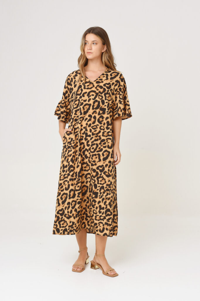 Vestido midi de escote pico y manga corta terminado con volados. Detalle de estampa de leopardo a contraste. Bolsillos laterales ocultos en costura.