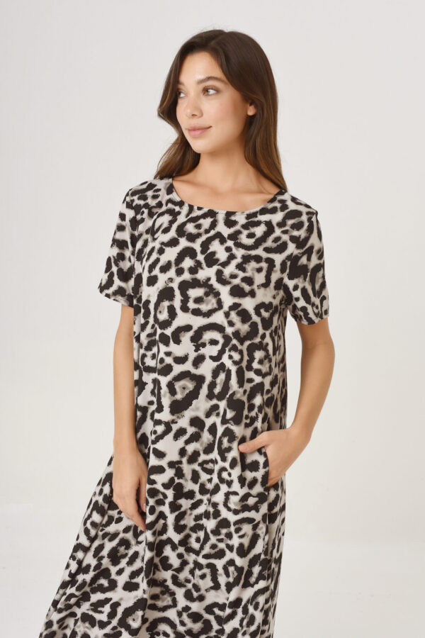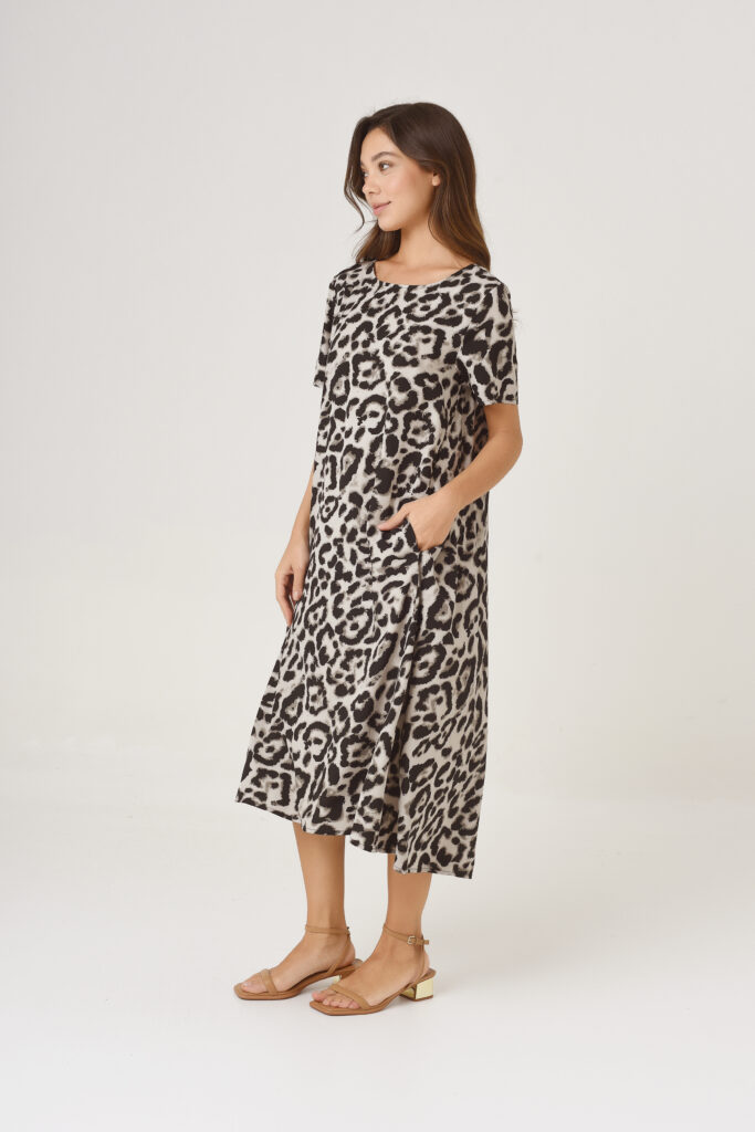 Vestido midi de escote redondo y manga corta. Detalle de estampa de leopardo a contraste. Bolsillos laterales ocultos en costura.MEDIDAS EN PLANO