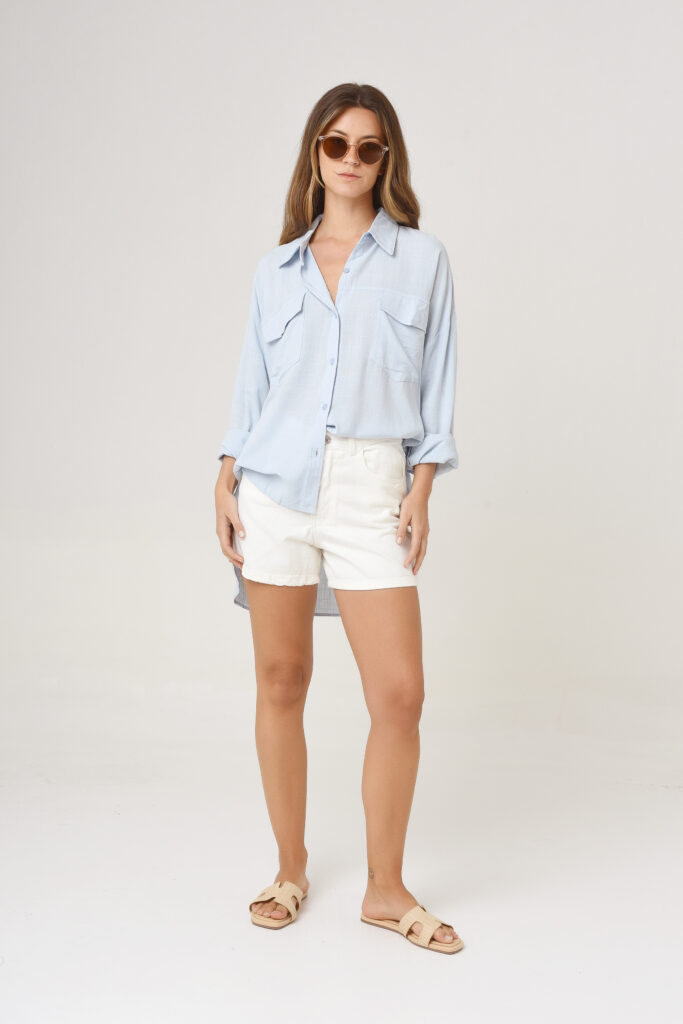 Camisa de cuello solapa y manga larga acabada en puño. Cierre frontal con botones. Falso bolsillo con solapa en delantero.MEDIDAS EN PLANO