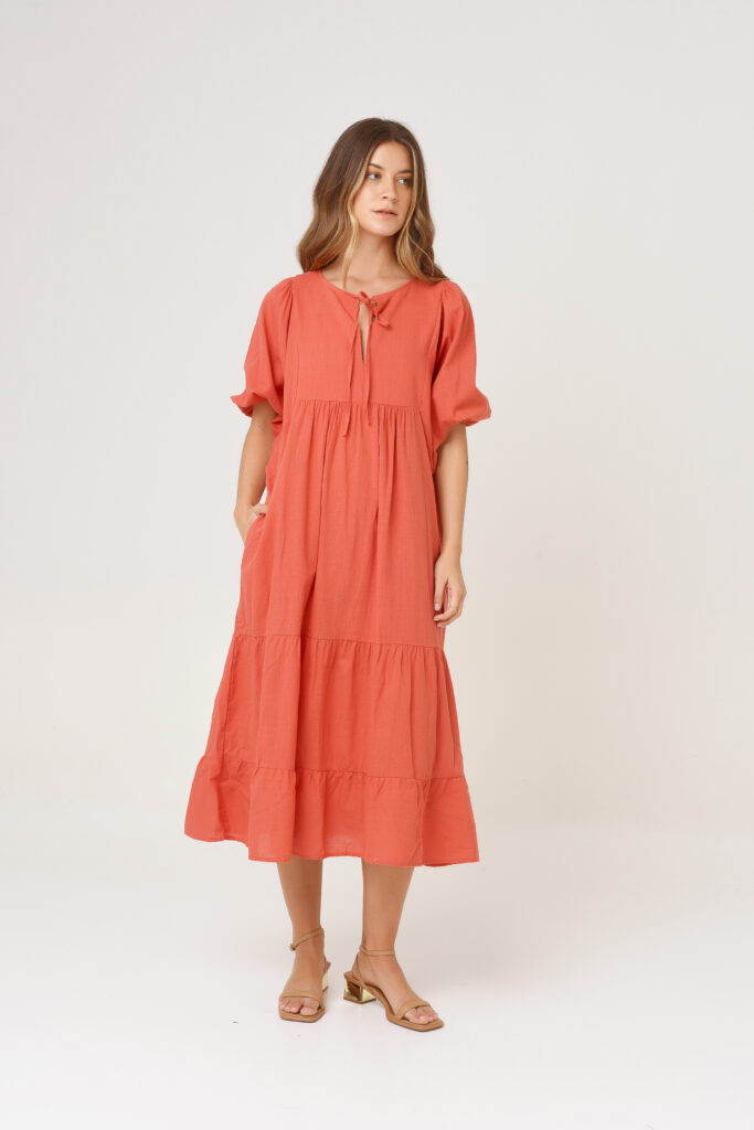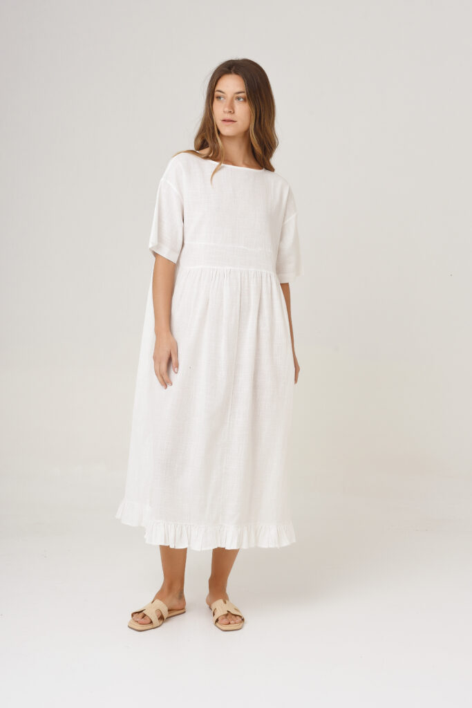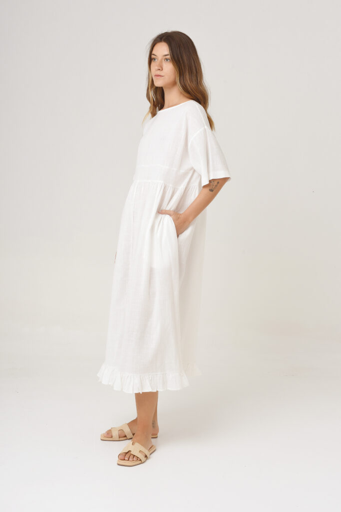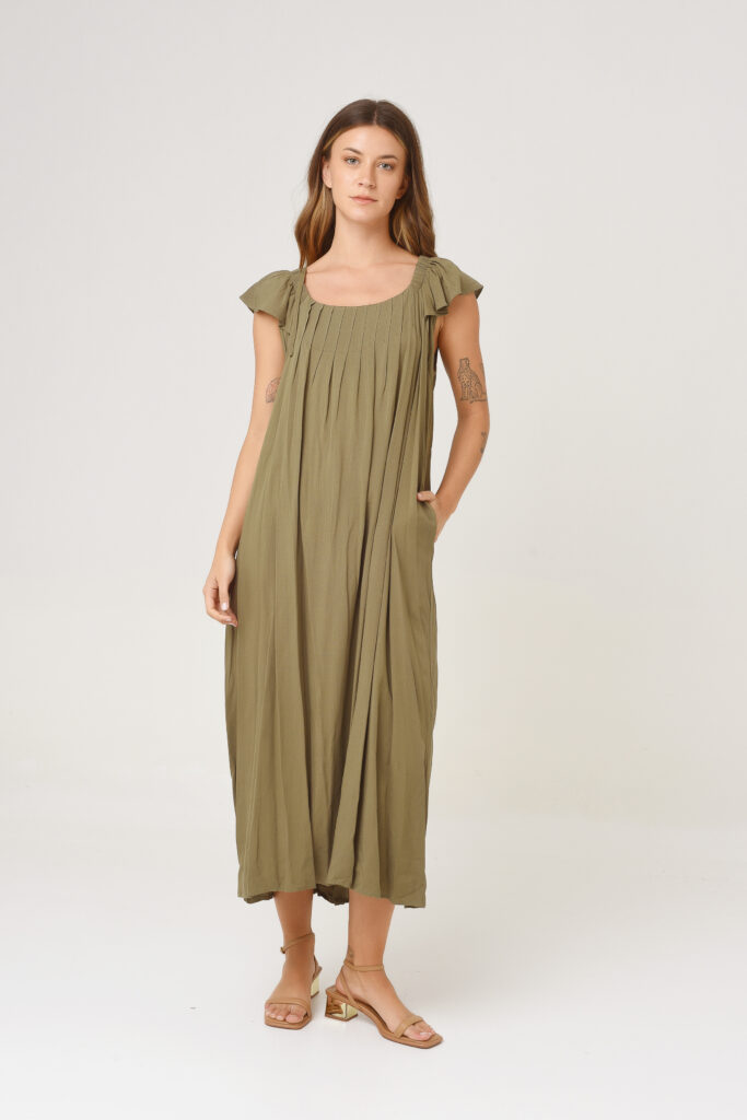 Vestido midi de cuello redondo sin mangas. Bajo acabado con tajos lateriales y volados en la espalda. Bolsillos laterales ocultos en costura.MEDIDAS EN PLANO