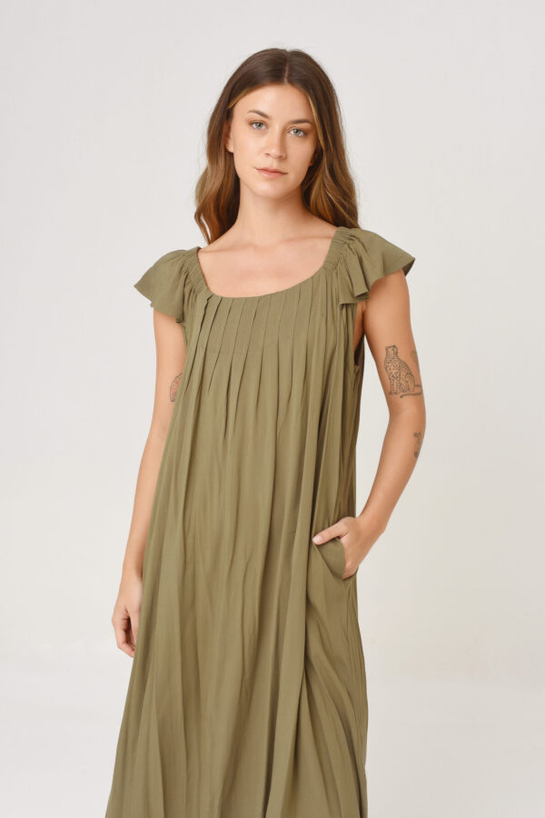 Vestido con cuello redondo y manga corta volado. Detalle de pliegues en delantero. Elástico en hombros y espalda. Detalle cut out y aplique nudo en espalda. Bolsillos laterales ocultos en costura.