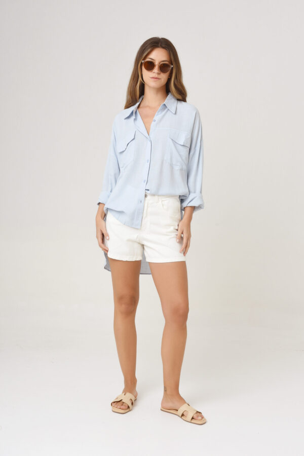 Camisa de cuello solapa y manga larga acabada en puño. Cierre frontal con botones. Bolsillo de plastrón con solapa en delantero.MEDIDAS EN PLANO