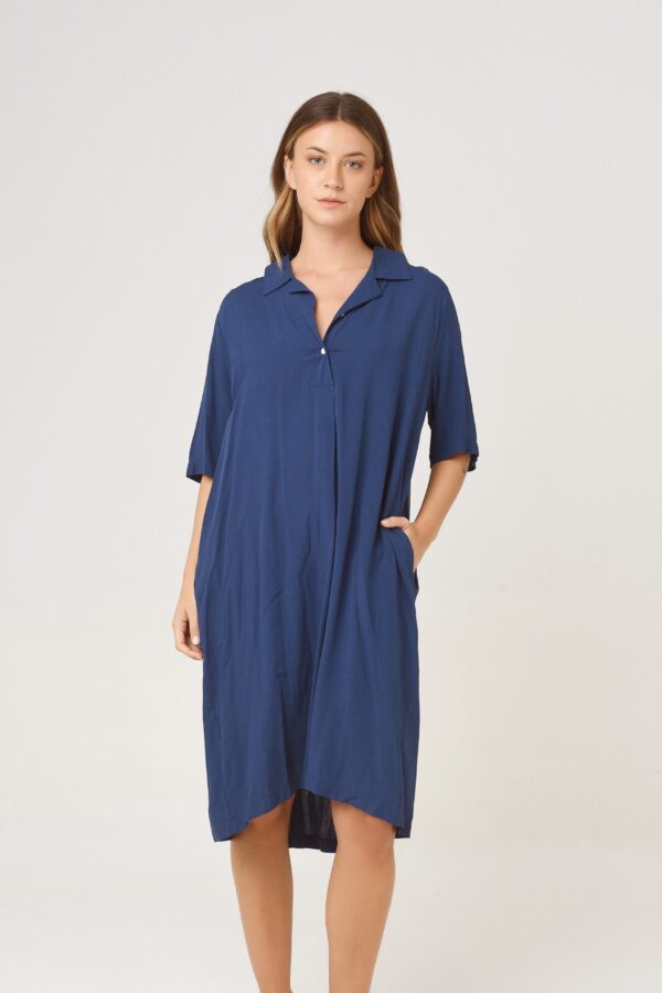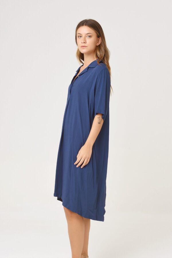 Vestido corto y escote pico con cierre frontal con botones. Cuello solapa y manga corta. Bolsillos laterales ocultos en costura. Detalle de pinza en la espalda.MEDIDAS EN PLANO