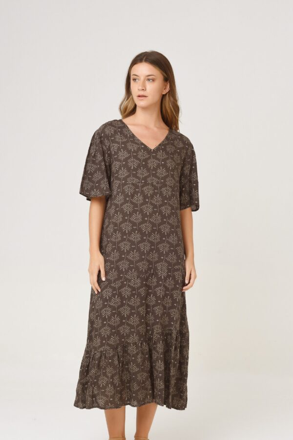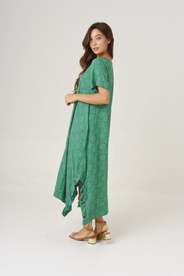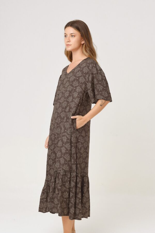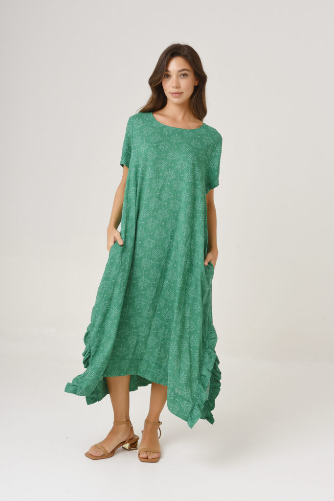Vestido midi confeccionado en hilo de algodón estampado. Cuello en pico y manga corta caída. Bajo acabado en volados. Bolsillos laterales ocultos en costura.