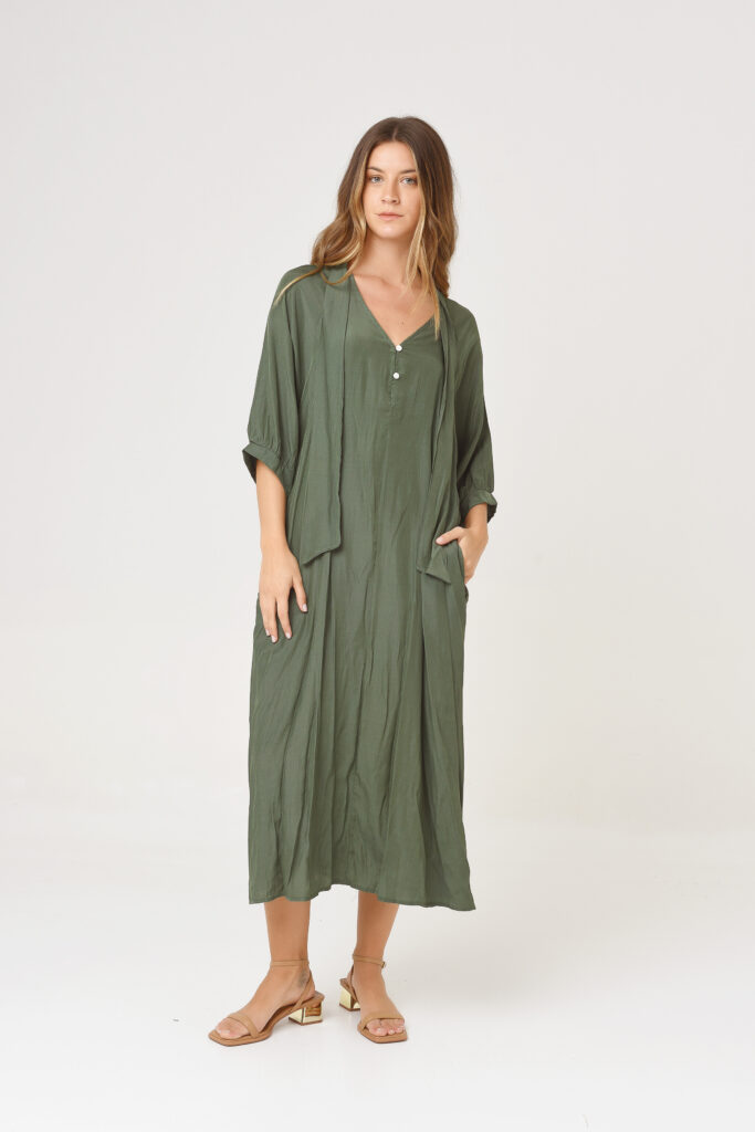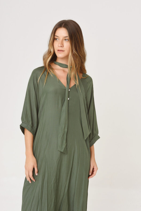 Vestido fluido largo de escote pico y manga al codo. Detalle de lazo que se puede usar en el cuello (ver fotos) o cintura. Cierre con botón frontal.
