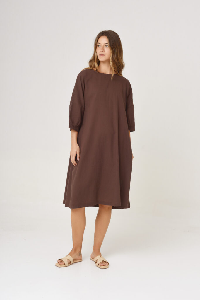 Vestido midi de escote redondo. Manga corta. Bolsillos laterales ocultos en costura. Bajo acabado con tajos laterales y volados.MEDIDAS EN PLANO