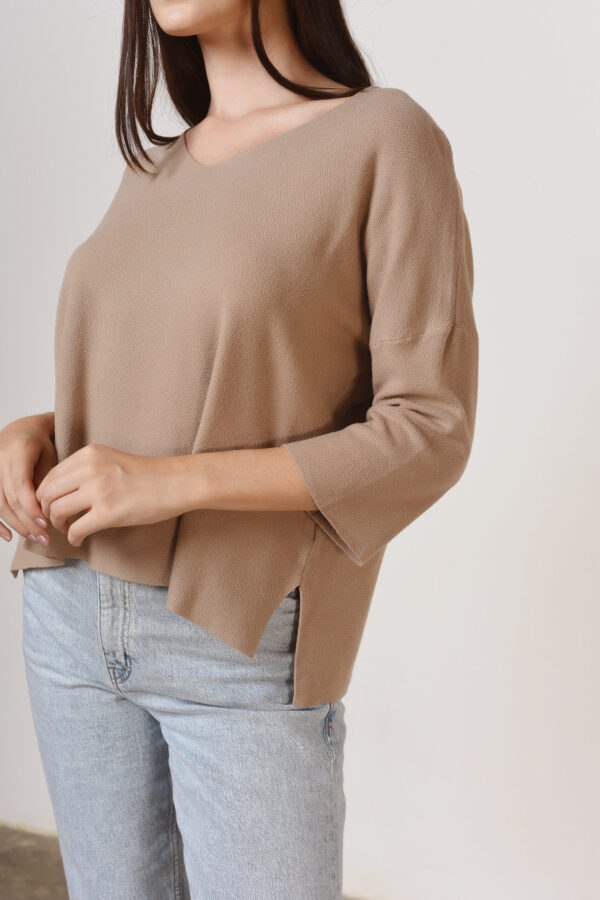 Sweater cuello V, con tajos en los costados y en la manga. Calidad: Bremer