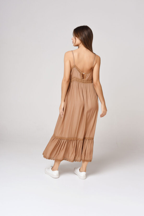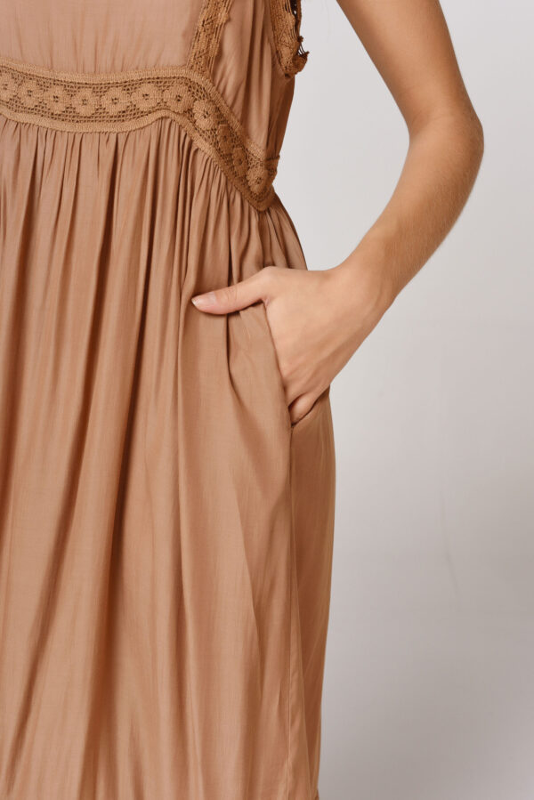 Vestido fluido midi de escote recto y tirantes finos ajustables. Detalle de puntilla combinada al tono. Cierre tipo lágrima con botón en espalda. Bajo acabado en paneles con pliegues. Bolsillos laterales ocultos en costura.