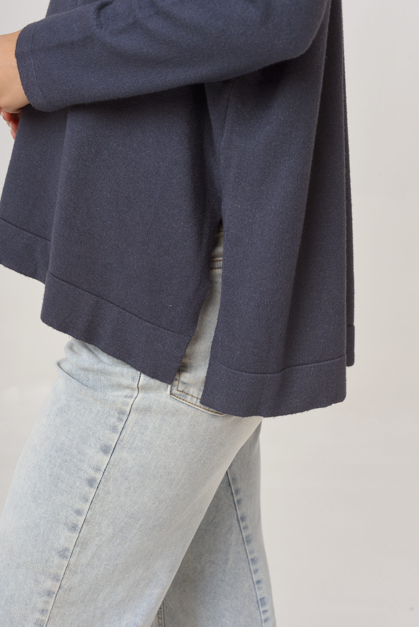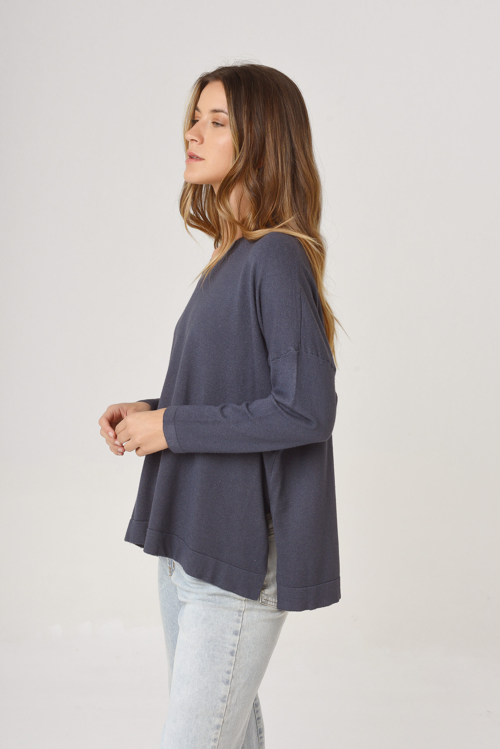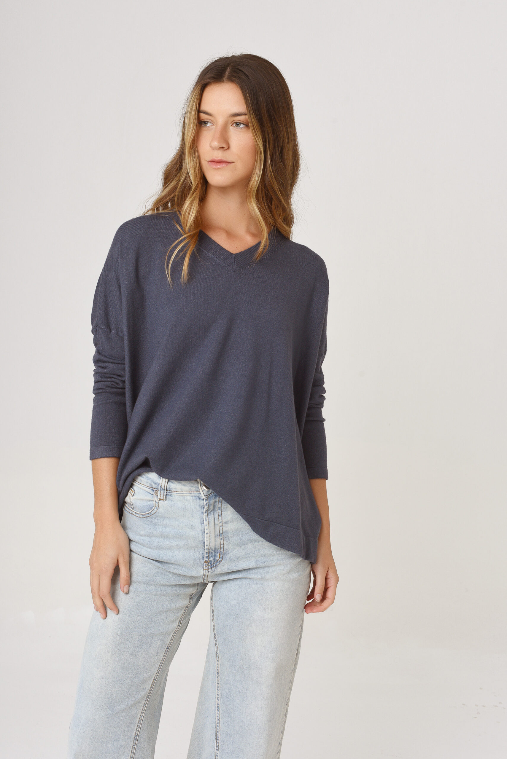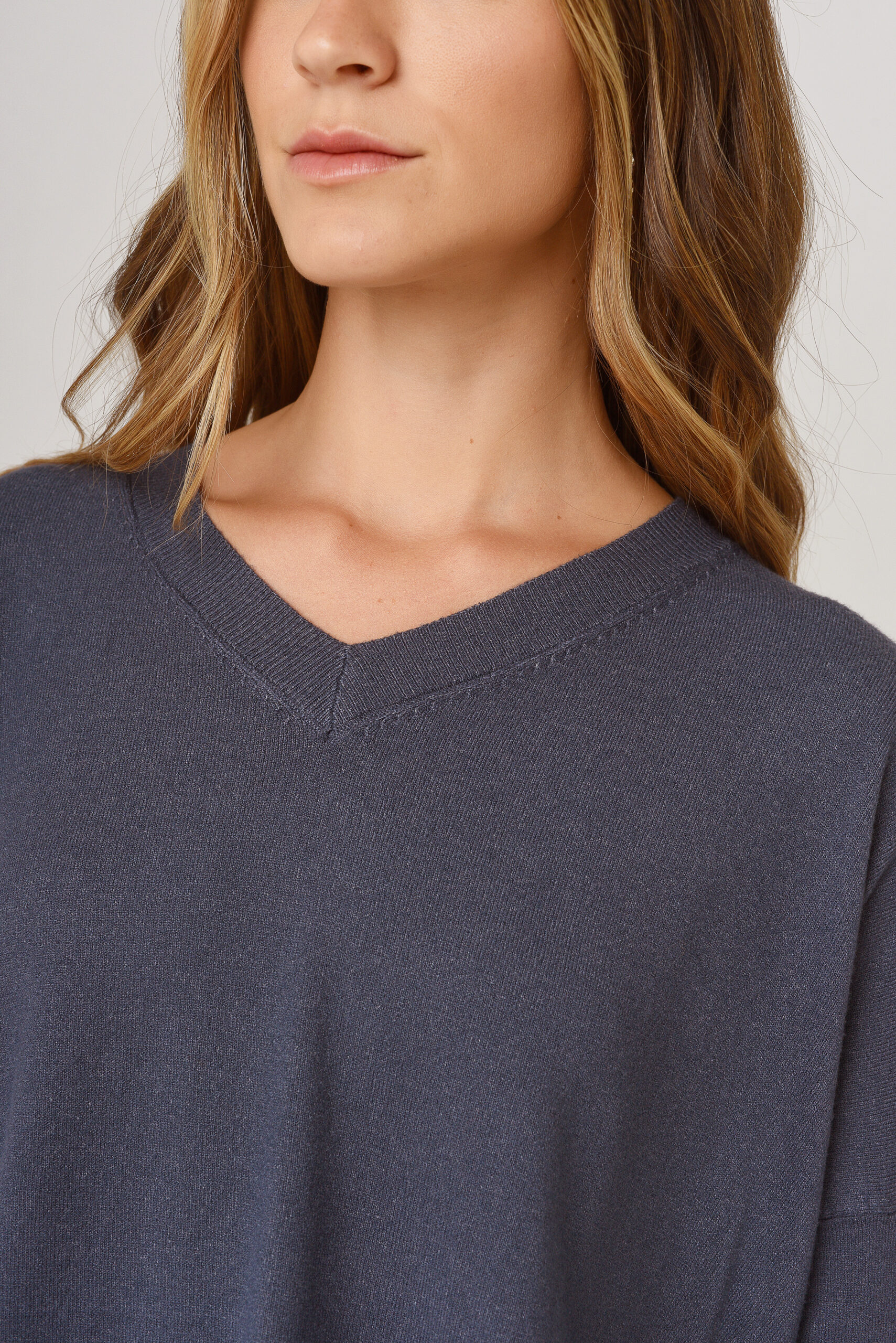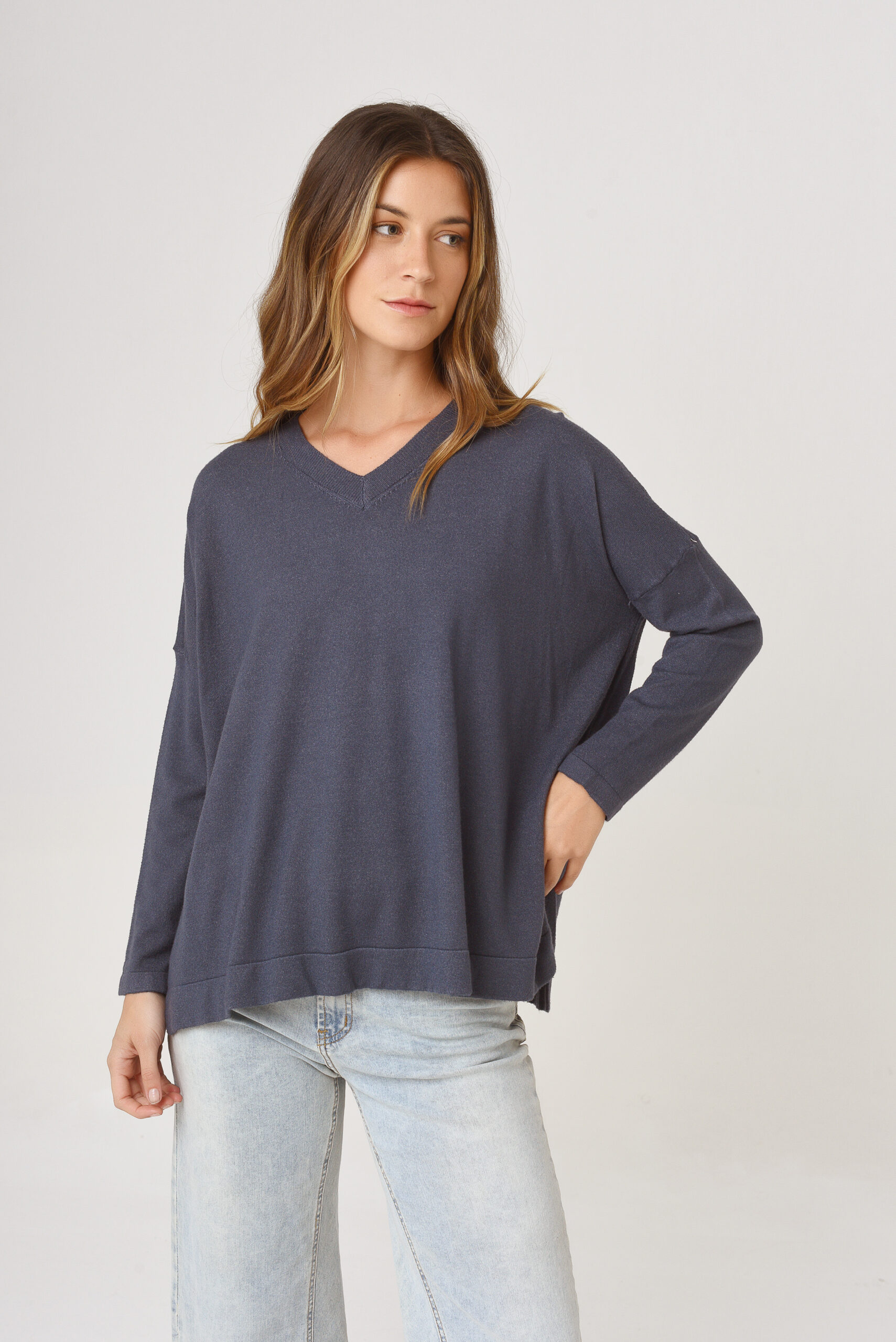 Saco de hilo con lurex. Cuello en V. Manga larga. Tejido en rib.