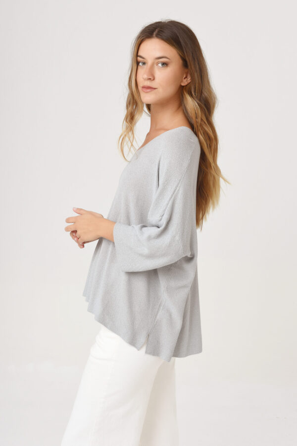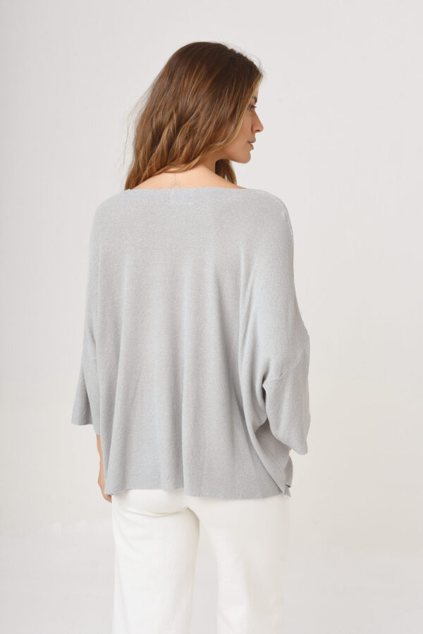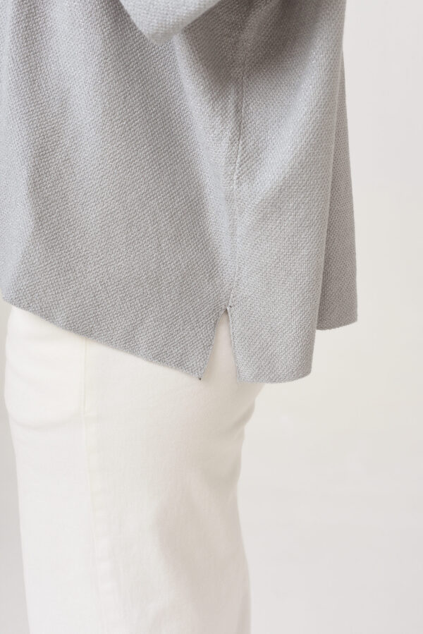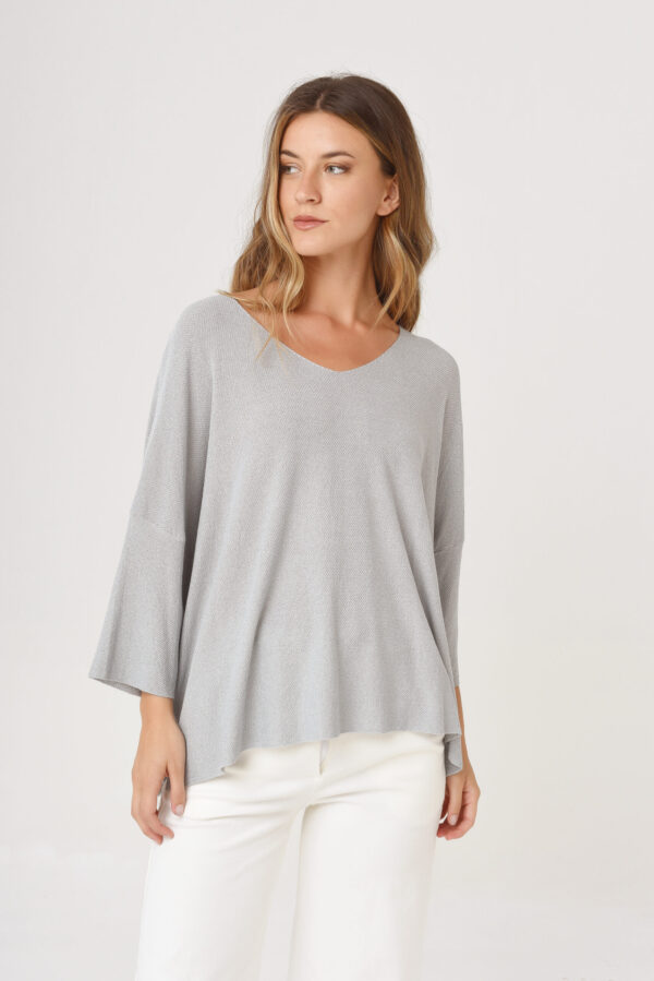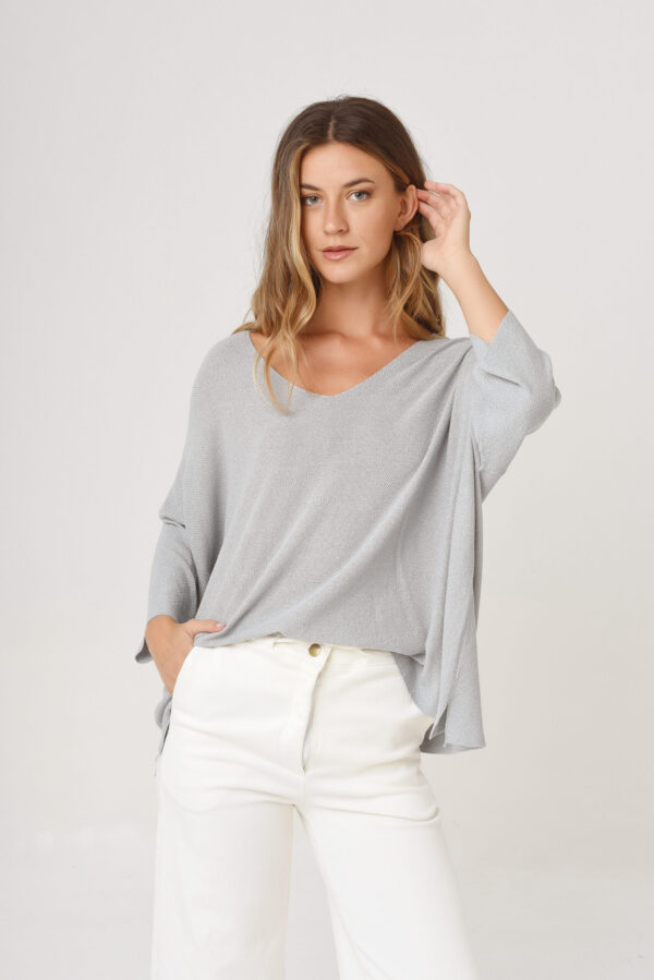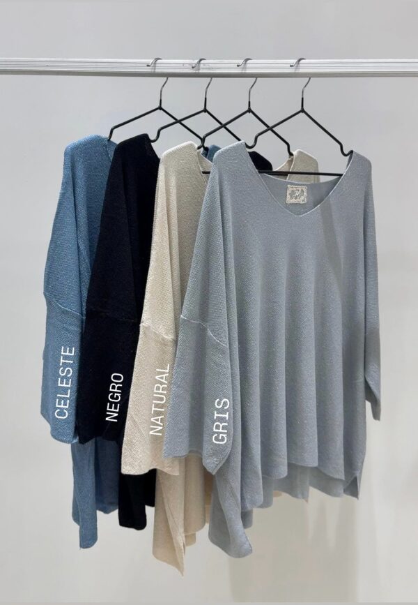 Saco de hilo con lurex. Cuello en V. Manga larga. Tejido en rib.