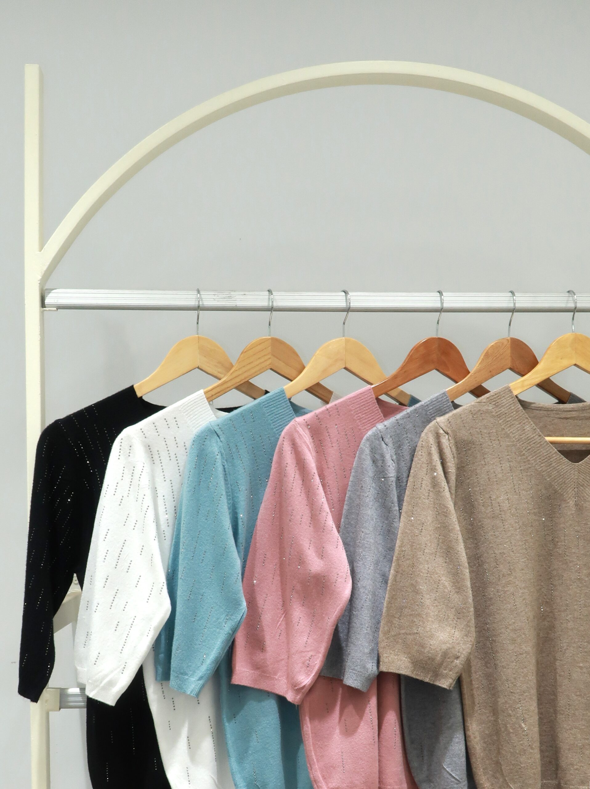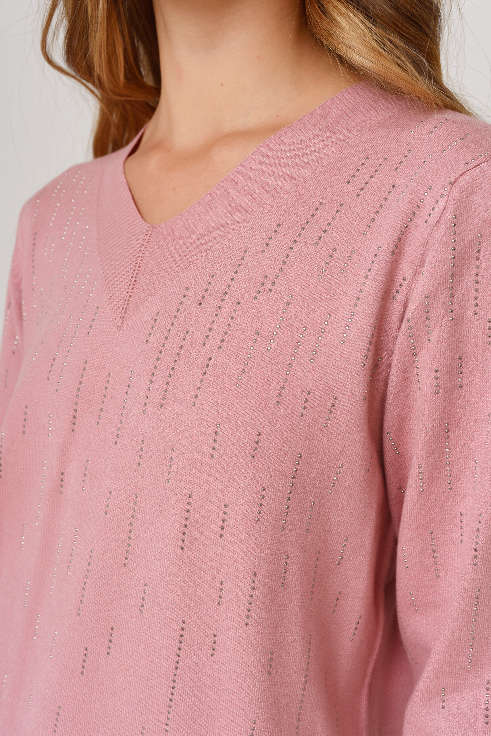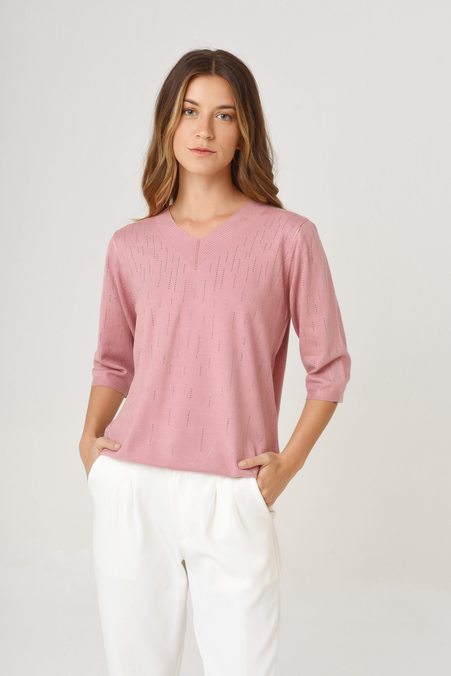 Sweater de hilo con lurex. Cuello en V. Manga larga. Con líneas del mismo color sin lurex.