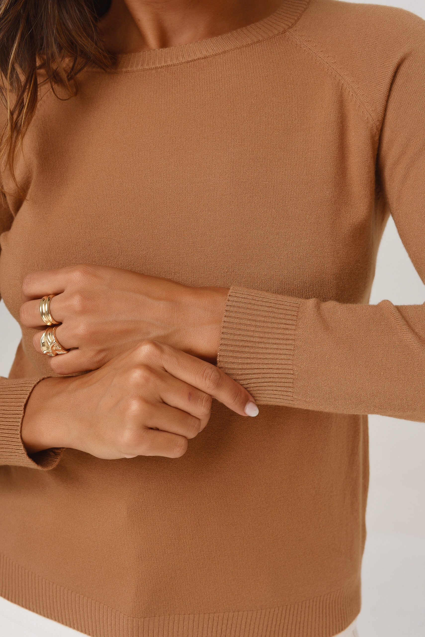 Sweater de hilo con lurex. Cuello en V. Manga larga. Con líneas del mismo color sin lurex.