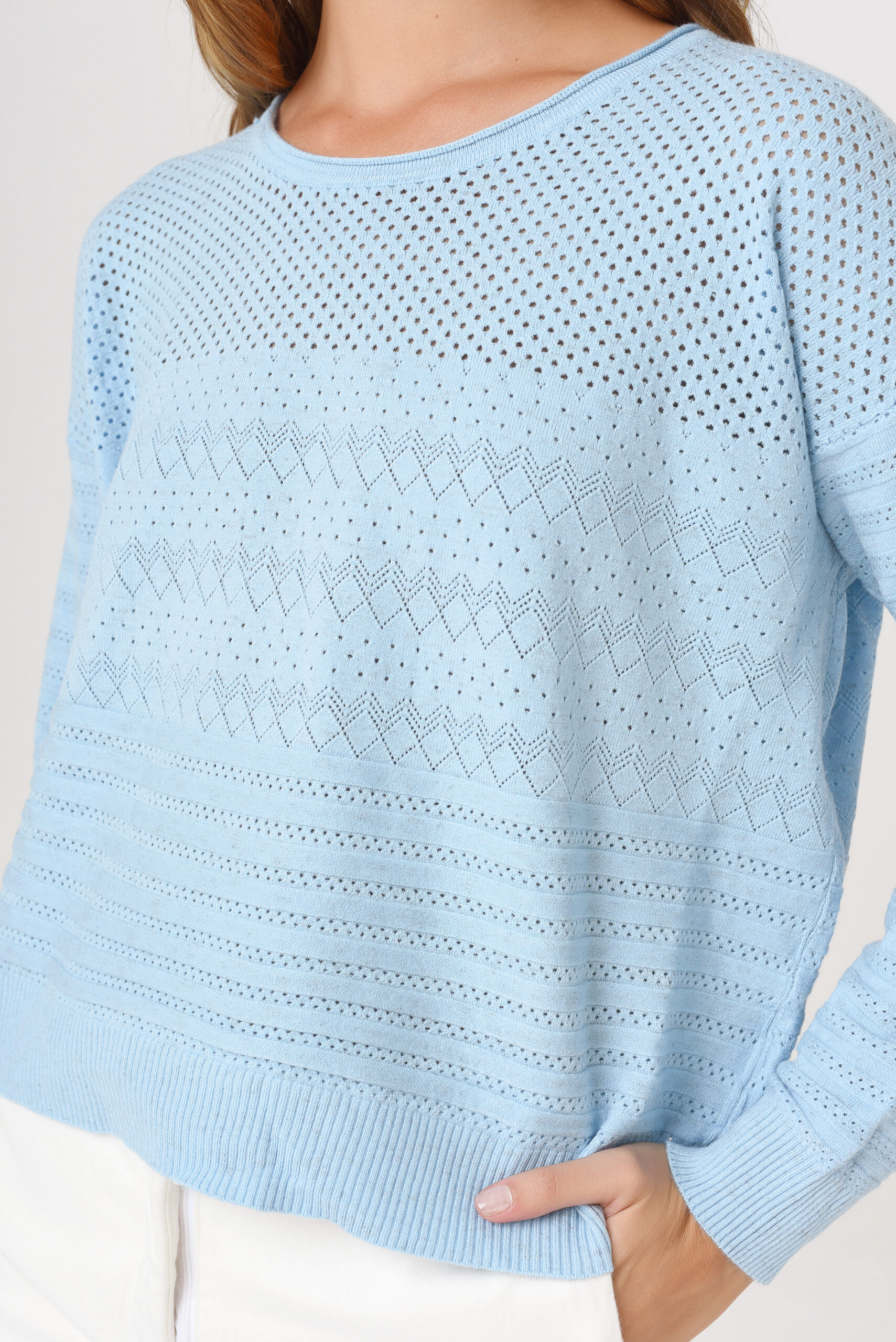 Sweater cuello redondo con varios tipos de calados y un poco de brillo en el tejido.