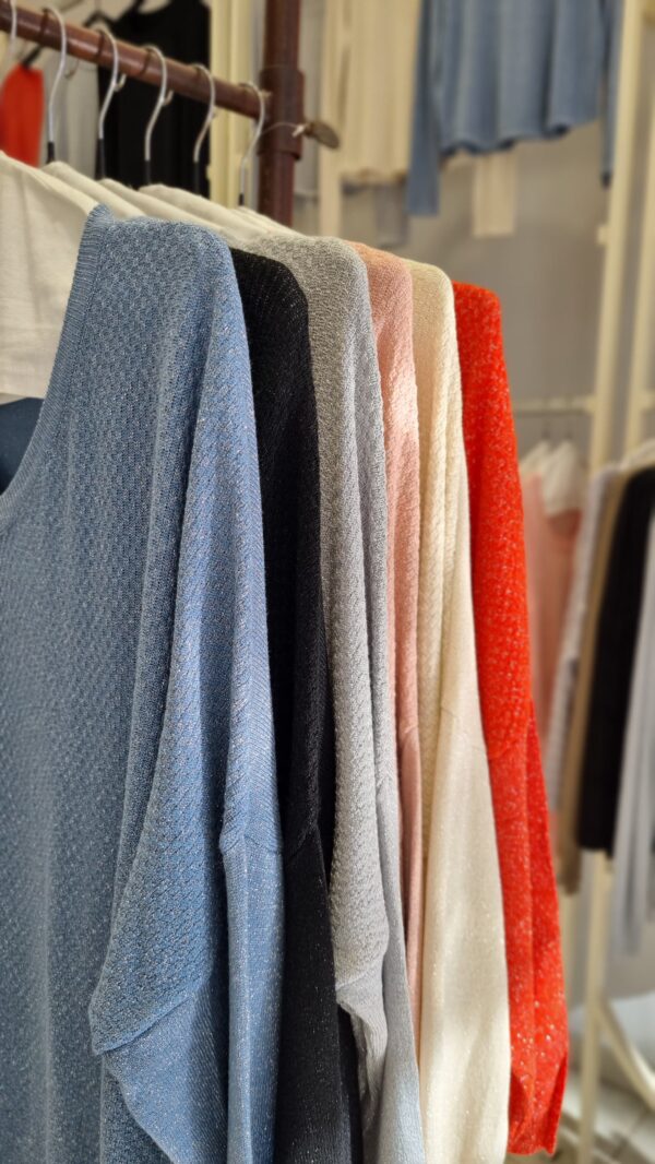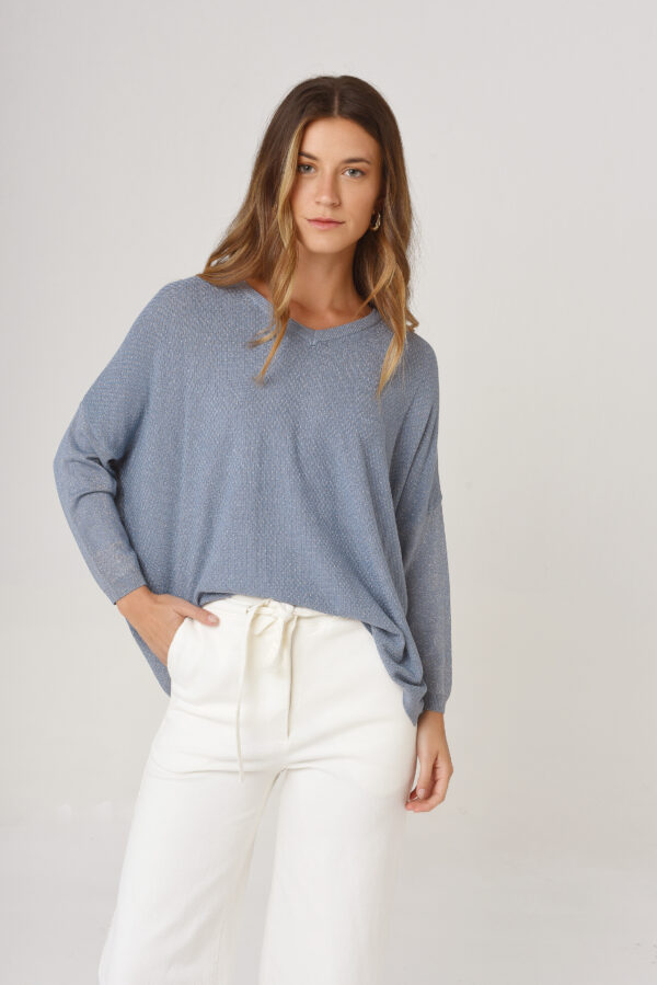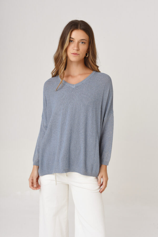 Sweater de hilo de lurex. Cuello V. Tejido tramado.
