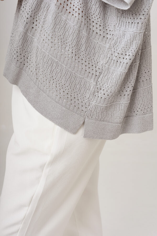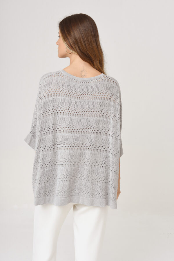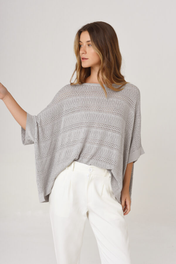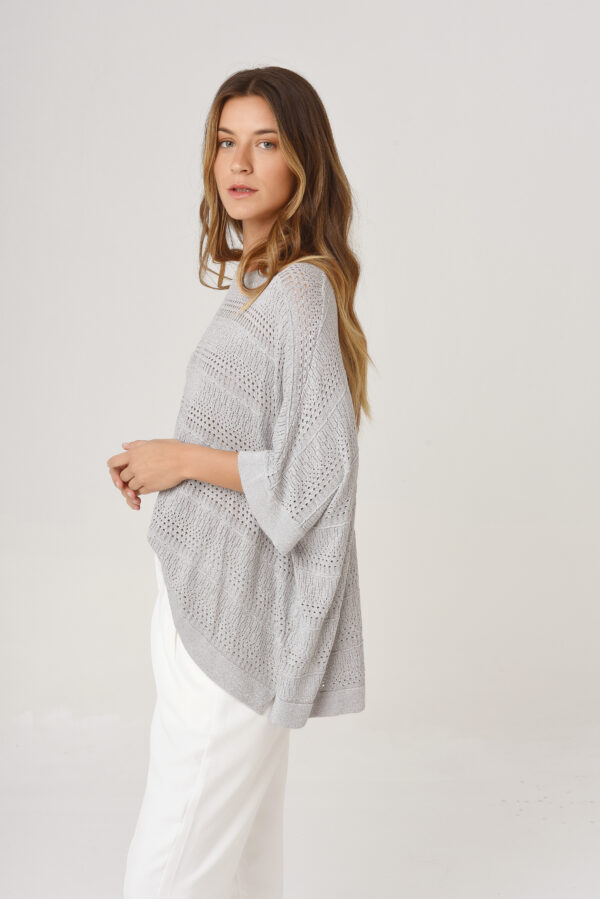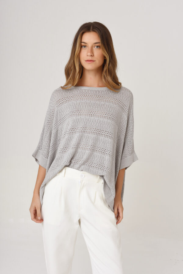 Sweater de hilo con lurex. Oversize manga al codo. Cuello redondo.