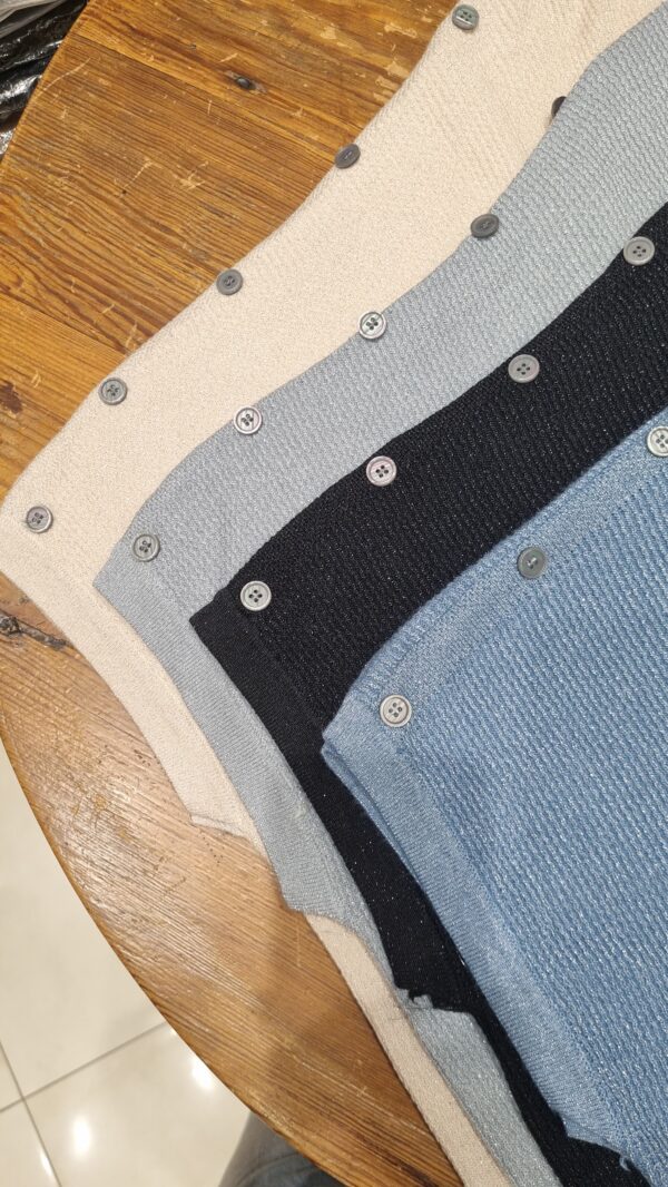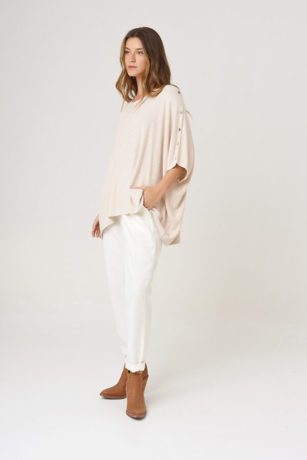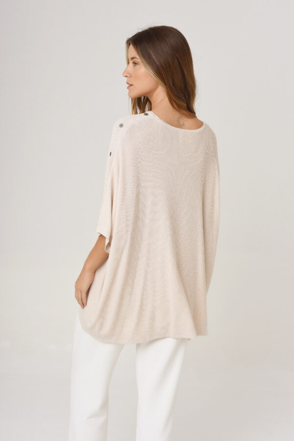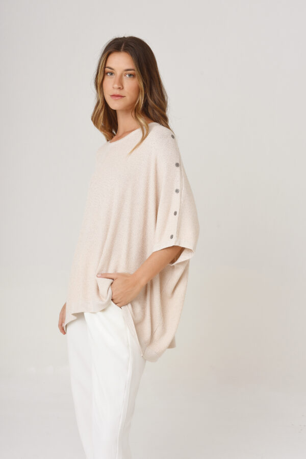Poncho de hilo con lurex. Cuello redondo. Botones decorativos en los hombros. Tejido en rib.