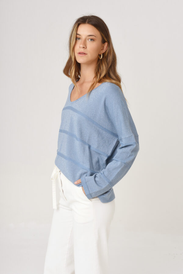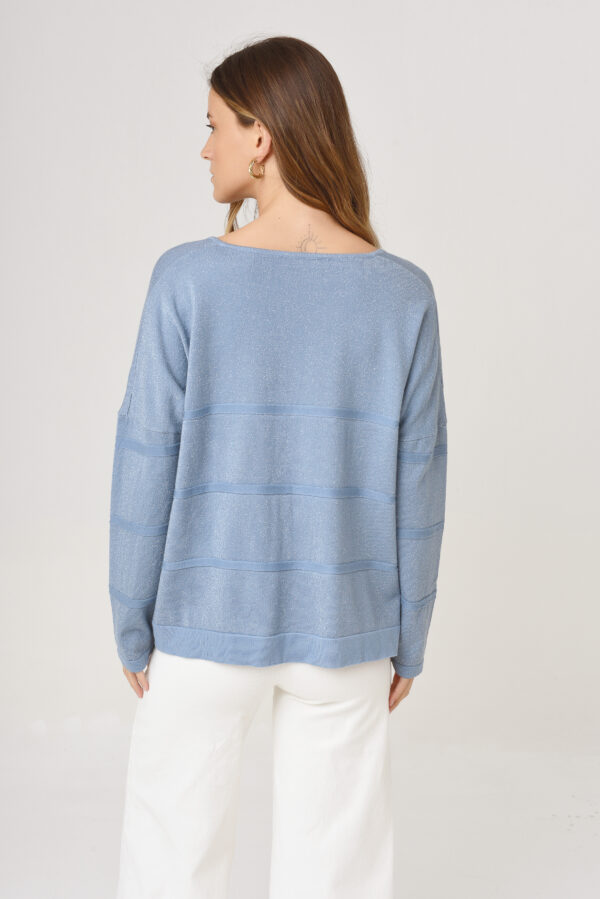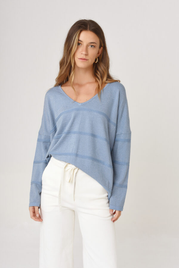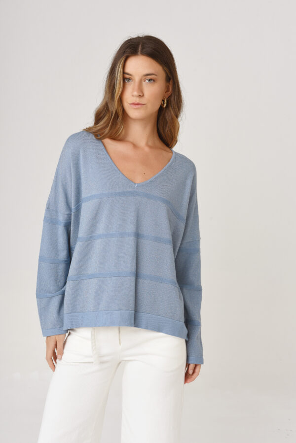 Sweater de hilo con lurex. Cuello en V. Manga larga. Con líneas del mismo color sin lurex.