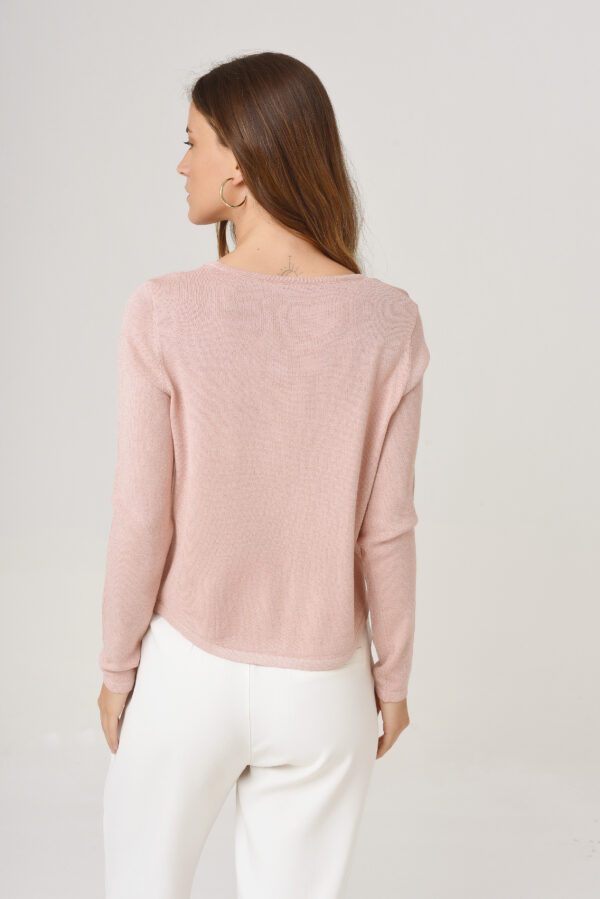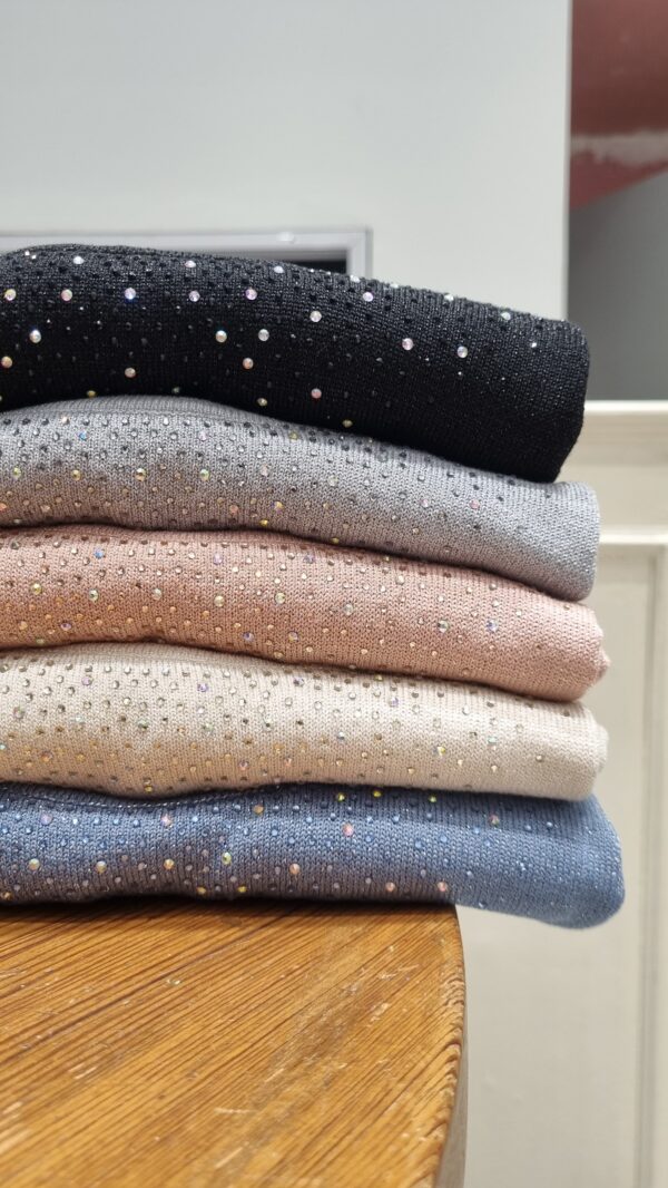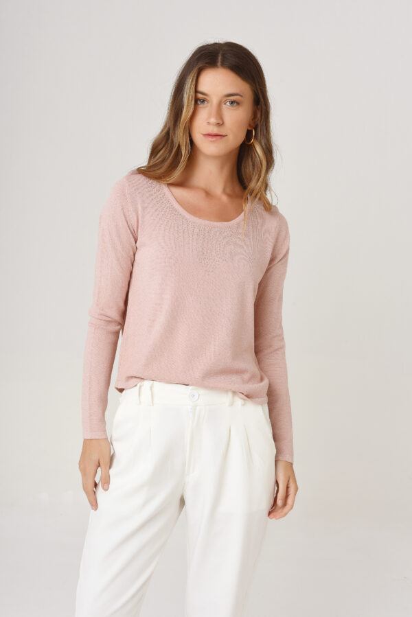 Sweater de hilo con lurex. Cuello redondo con strass. Manga larga