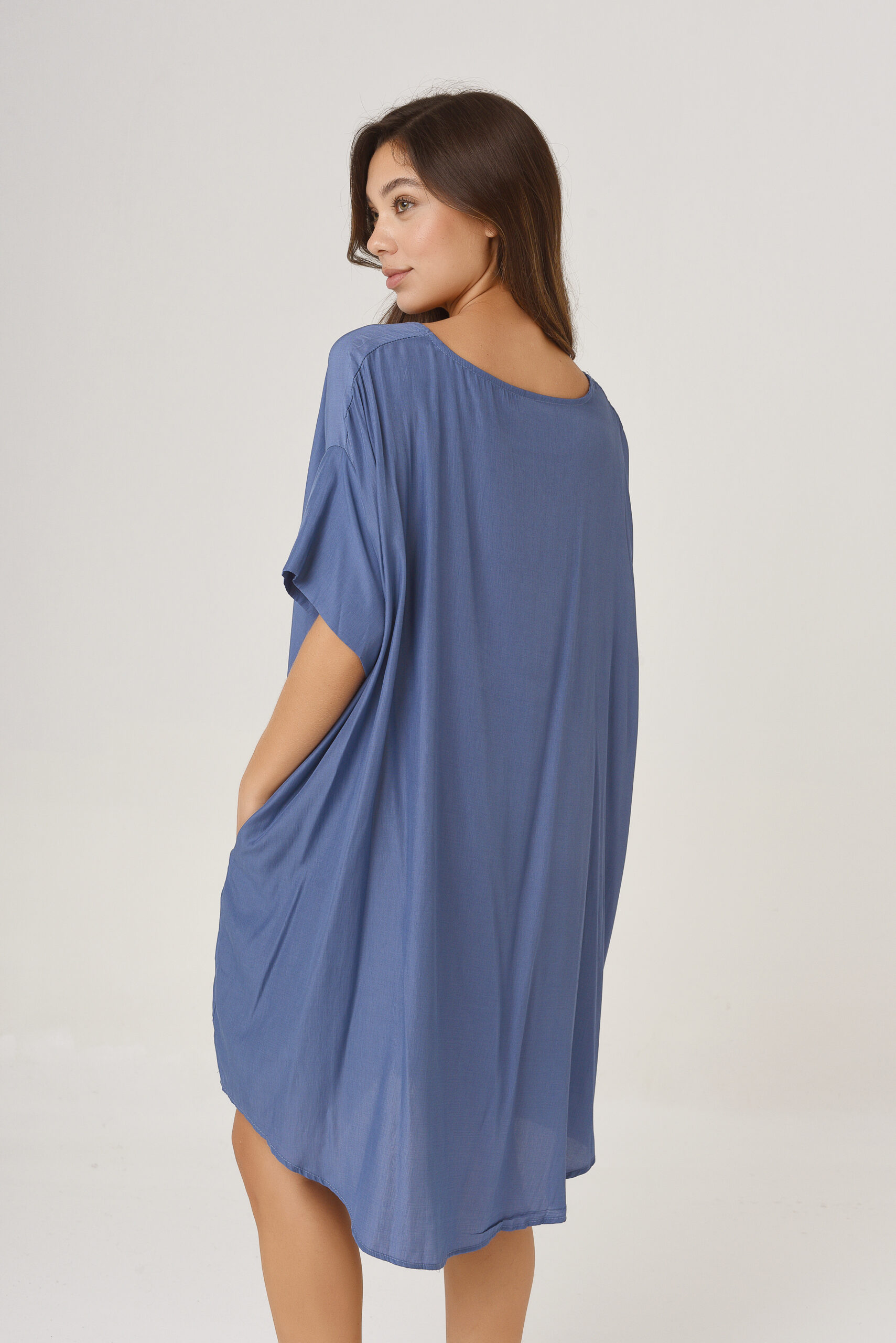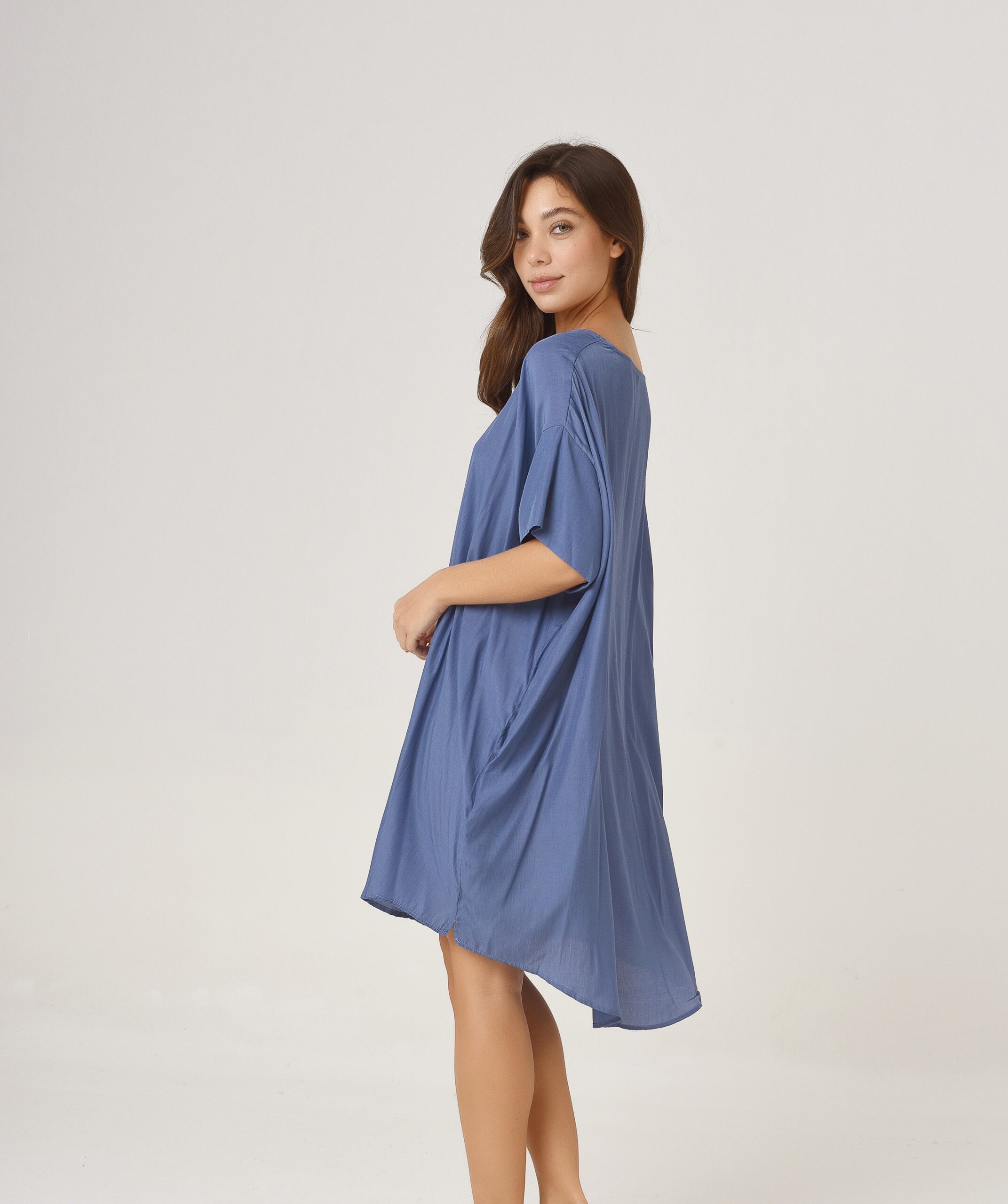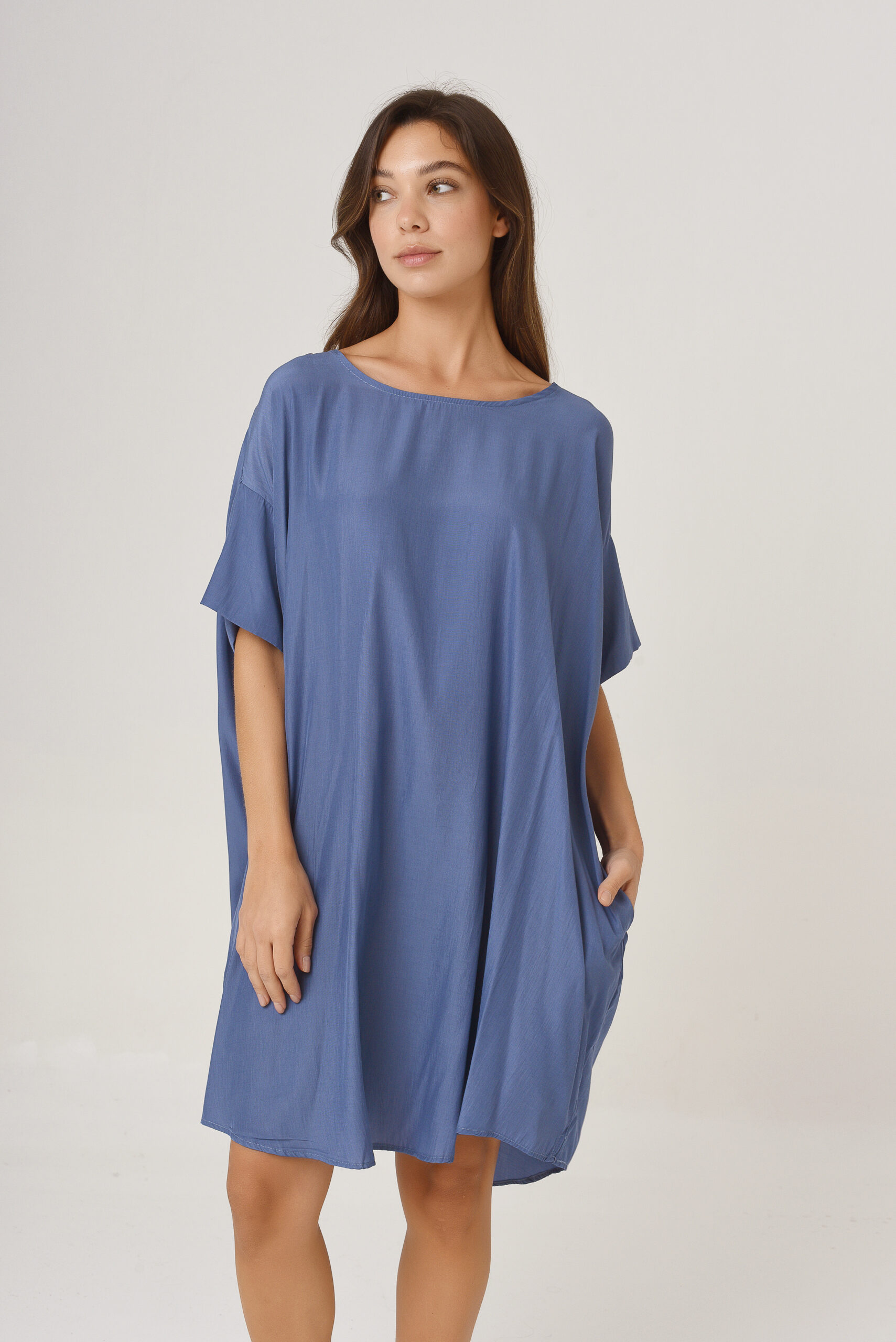 Vestido corto de cuello redondo y manga corta. Bolsillos laterales ocultos en costura.