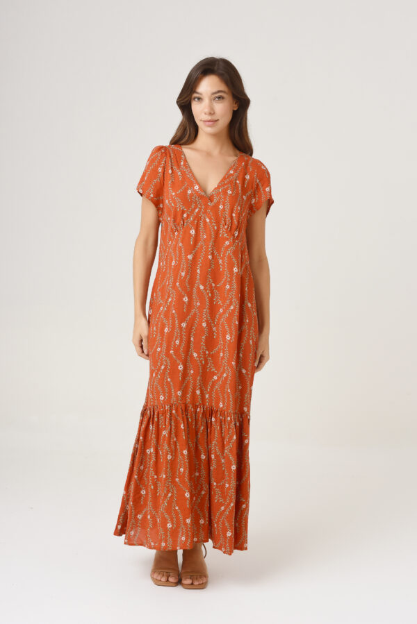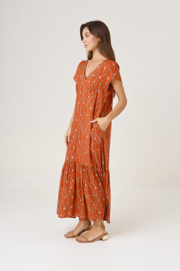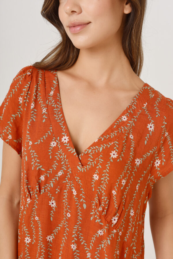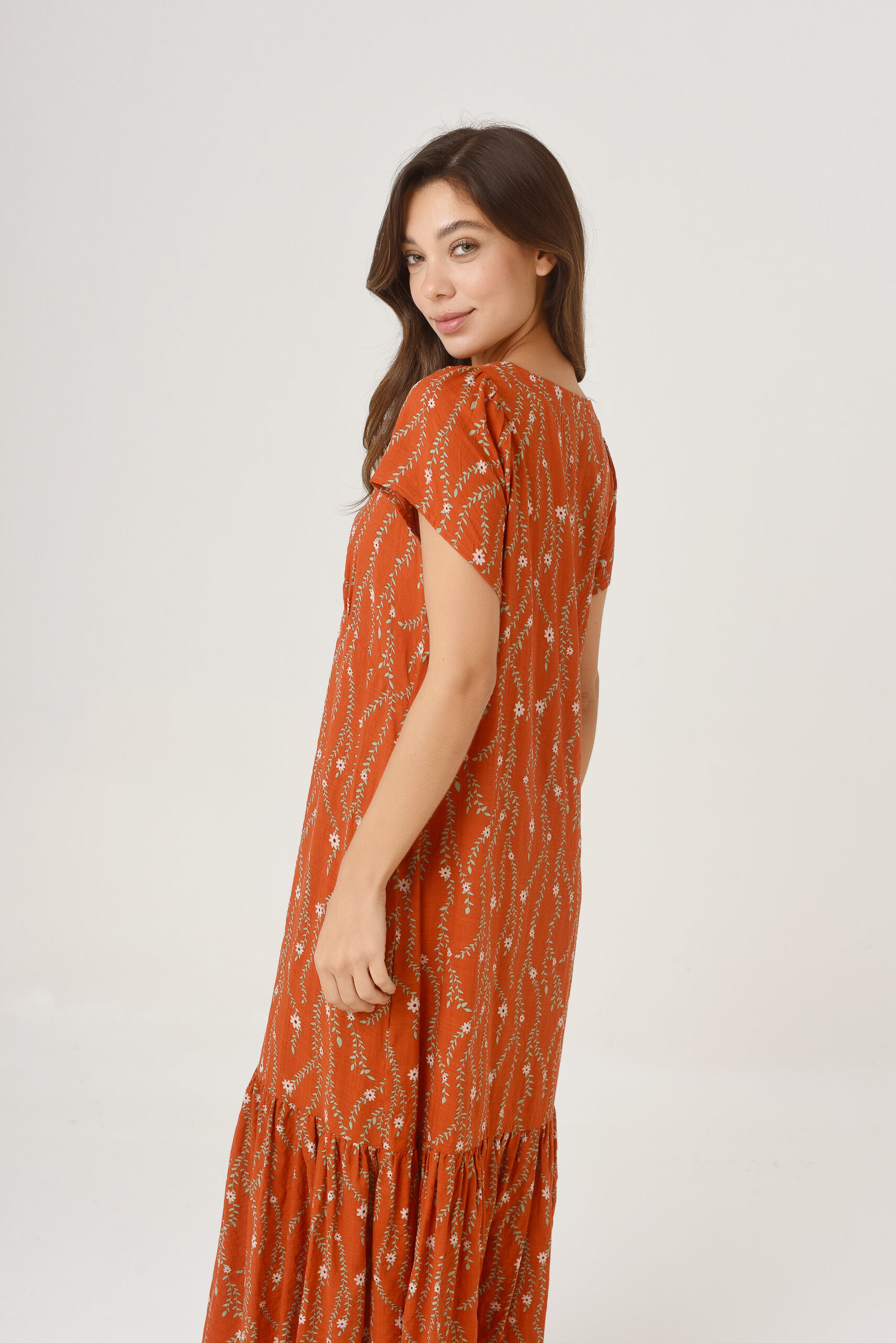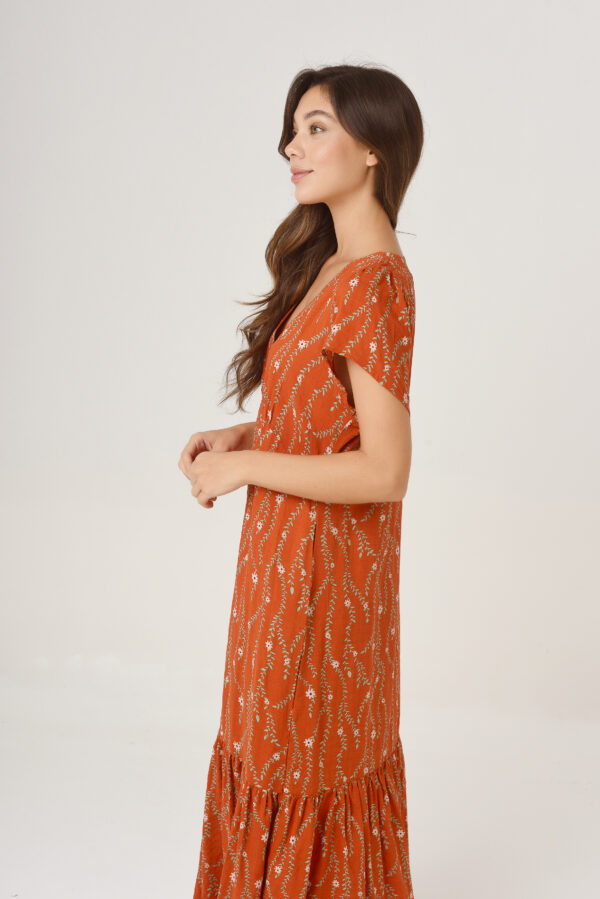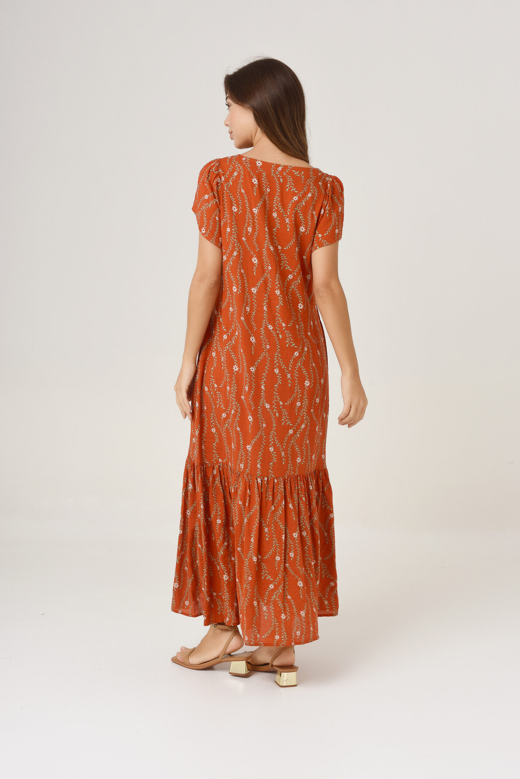 Vestido midi de escote pico y manga corta. Detalle de estampa floreado a contraste. Bajo acabado en paneles con pliegues.