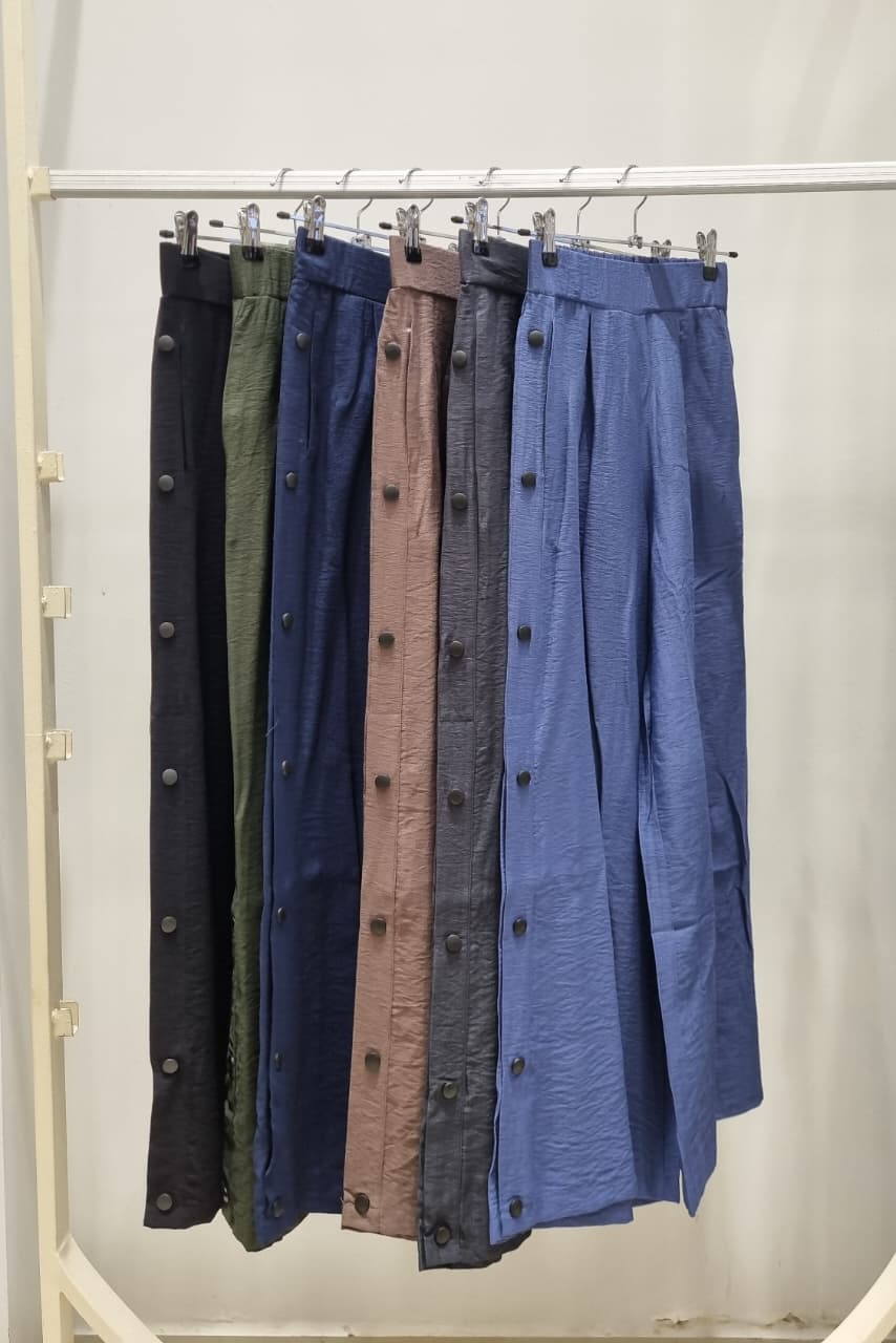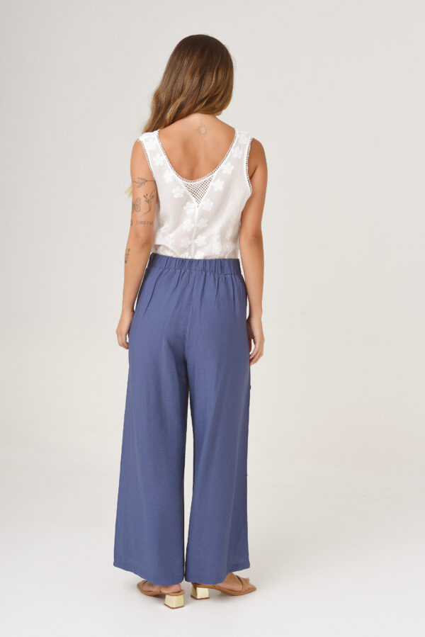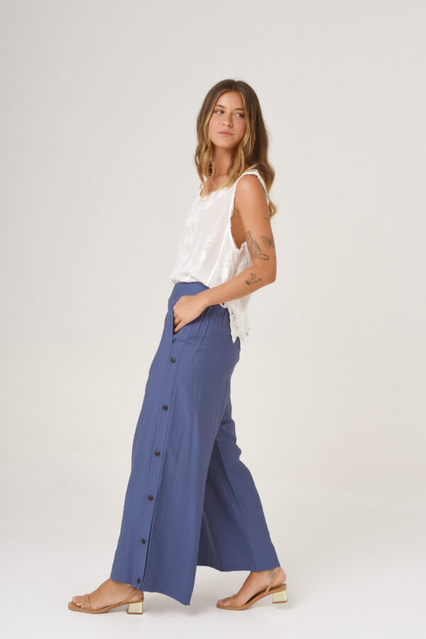 Pantalón de tiro medio con bolsillos en delantero. Cintura elástica en espalda. Pernera ancha. Cierre lateral con botones de color negro con cierre a presión.