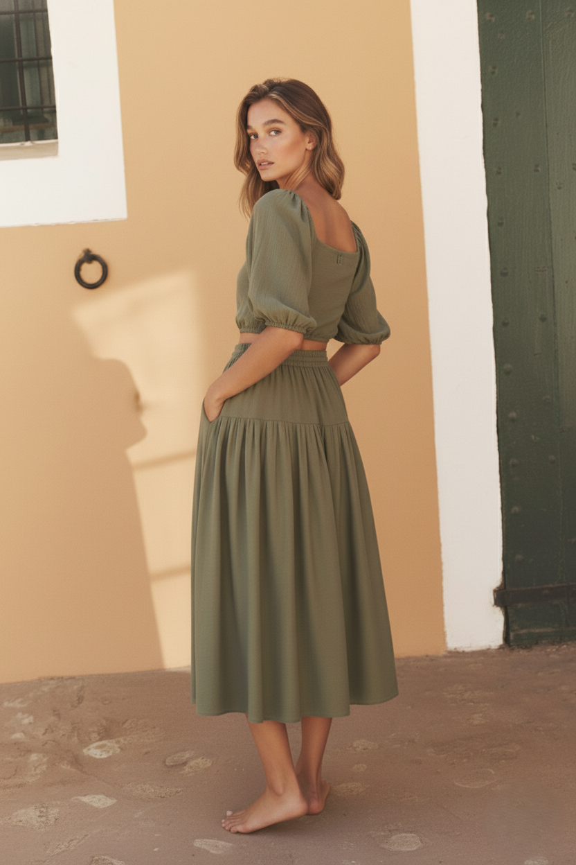 – Pollera de tiro medio con cintura elástica. Bolsillos laterales ocultos en costura.