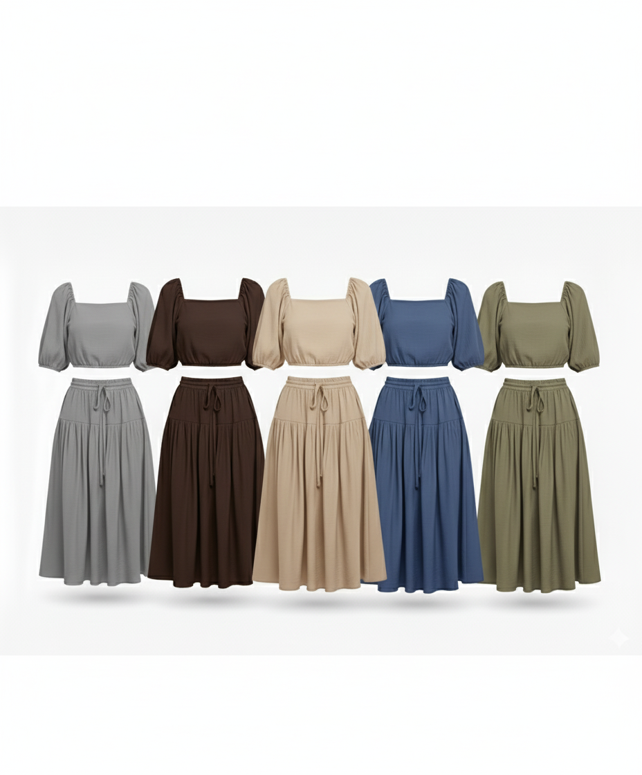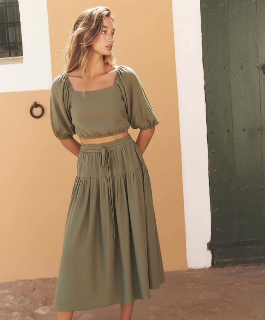 – Blusa manga por debajo del codo abullonada terminado en elástico. Cuello recto. Bajo ajustable con elástico.