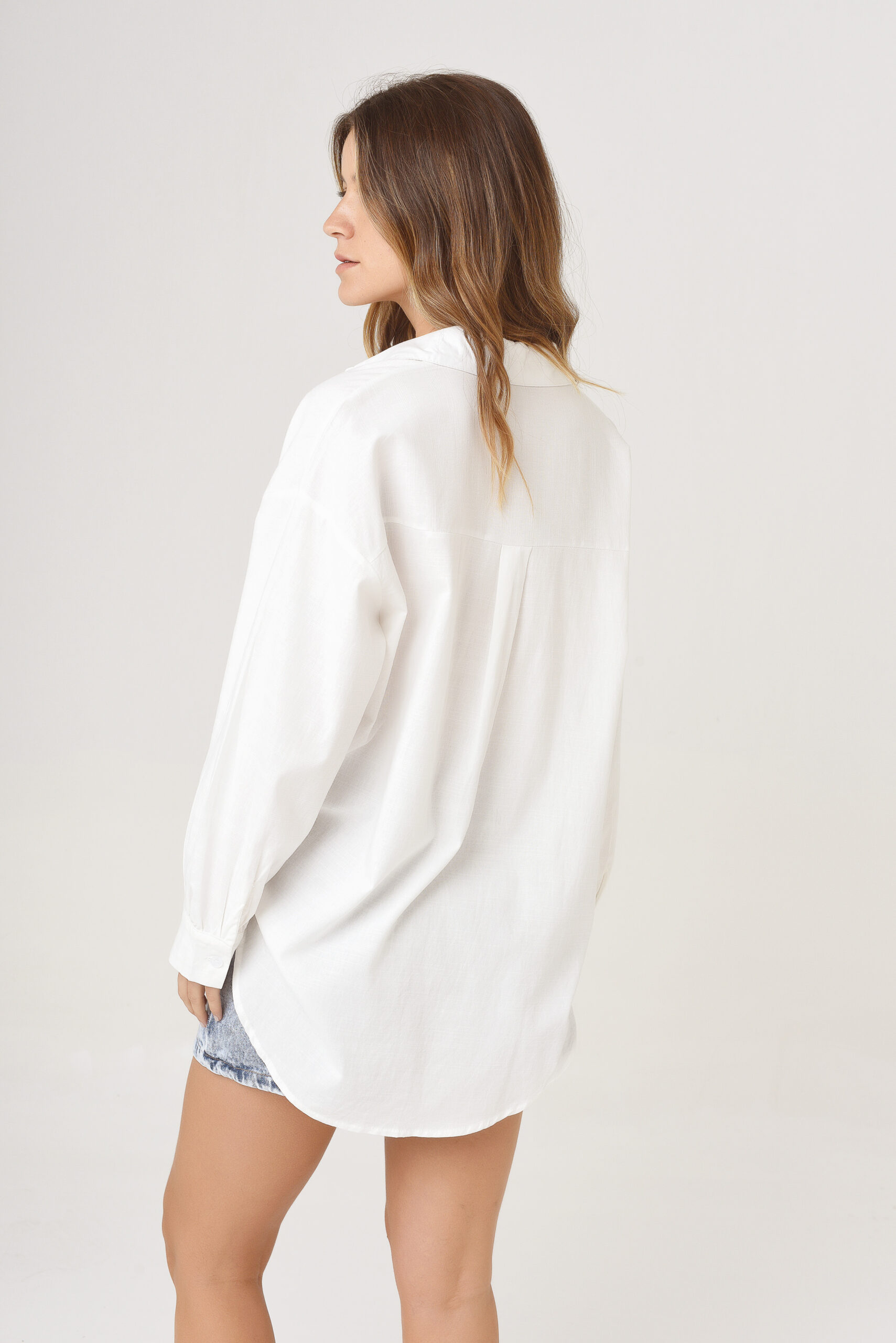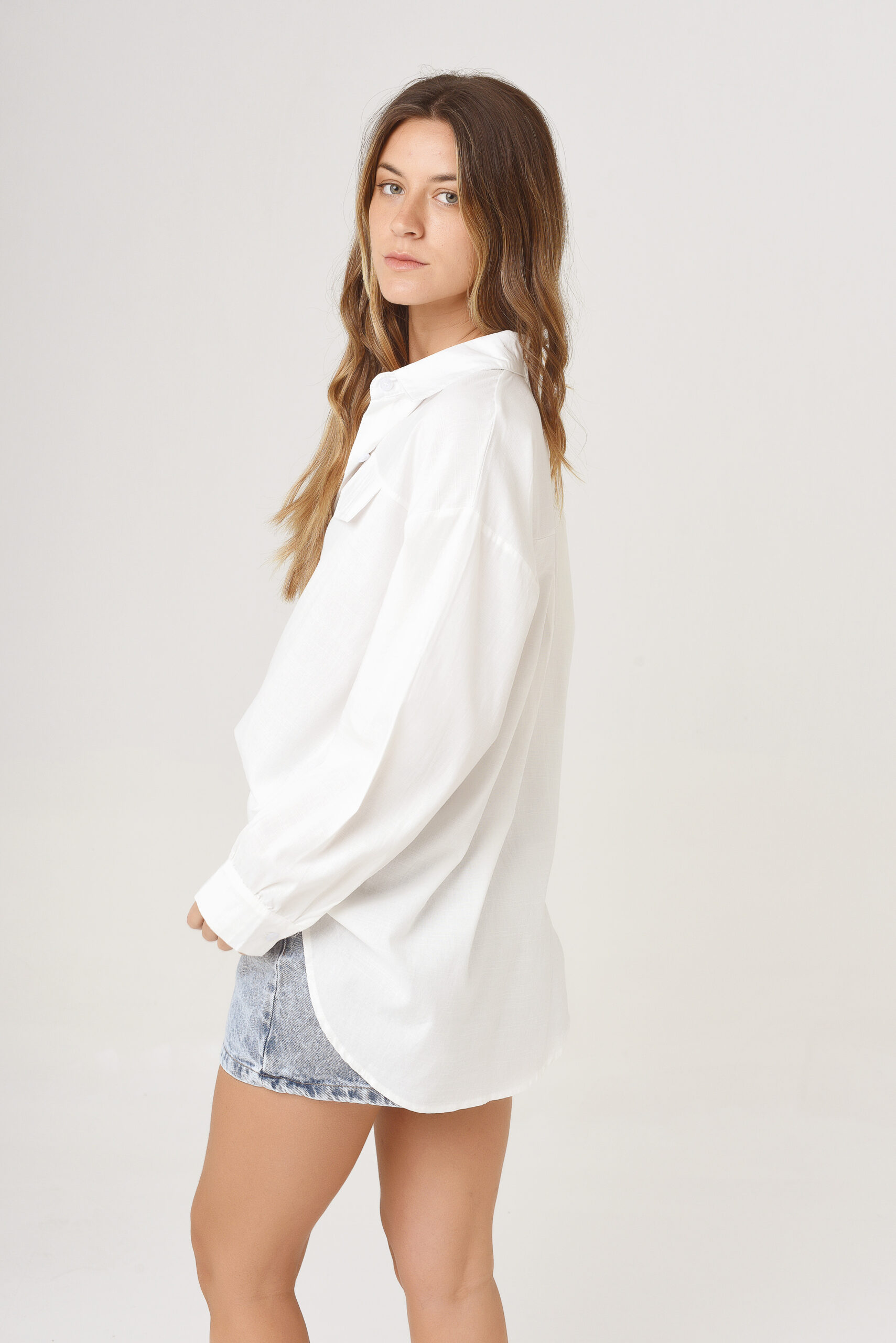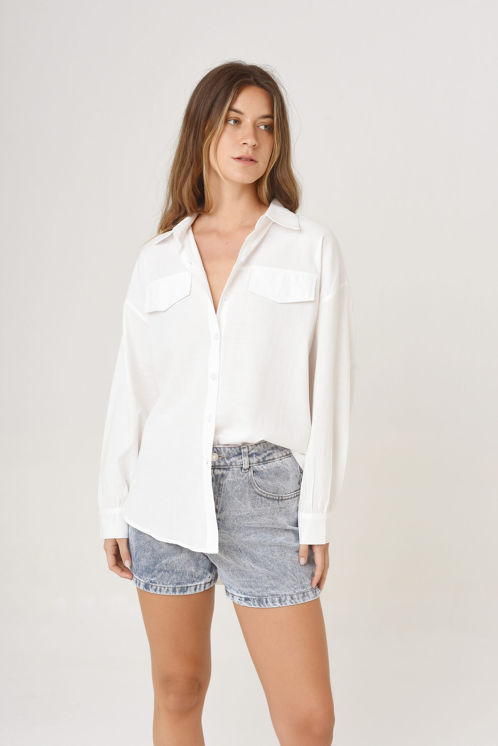 Camisa de cuello solapa y manga larga acabada en puño. Cierre frontal con botones. Falso bolsillo con solapa en delantero.