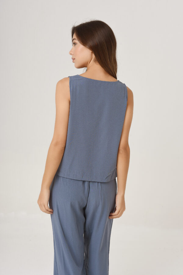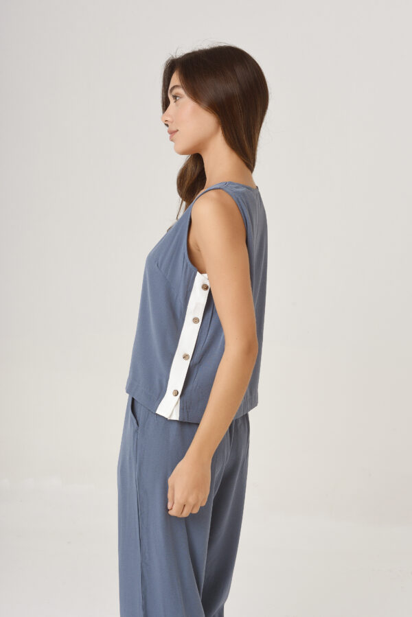 – Musculosa de cuello pico. Detalle lateral de acabados con línea a contraste con botones.